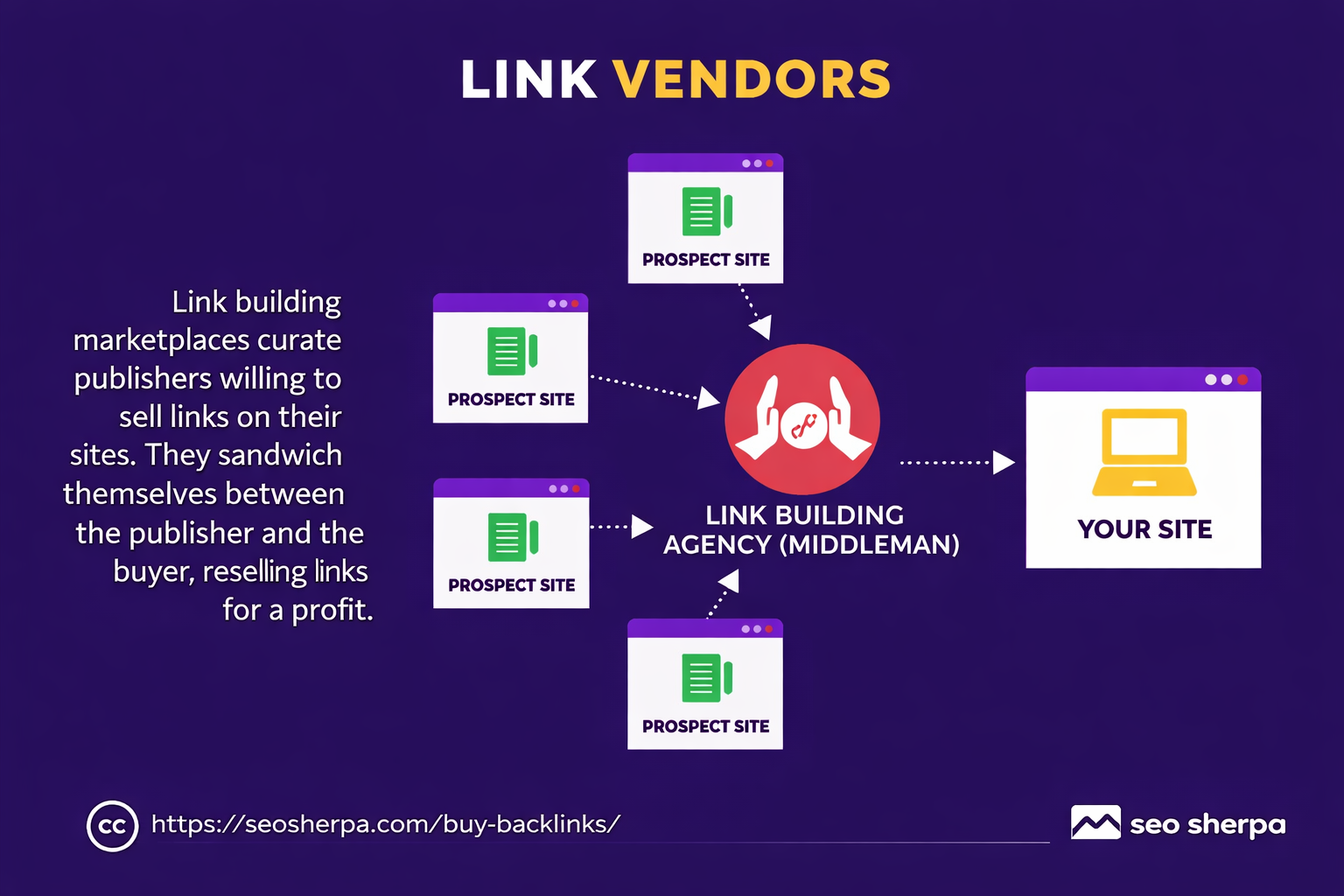 Link building marketplaces sandwich themselves between the website selling backlinks and the end-user (e.g. you) buying the backlinks.