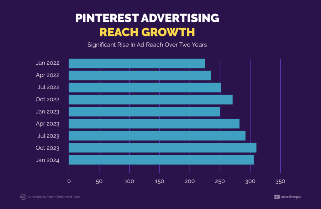 As of January 2024, Pinterest’s reported advertising reach is 307.6 million users. That’s a big jump from 249.7 million the year before.