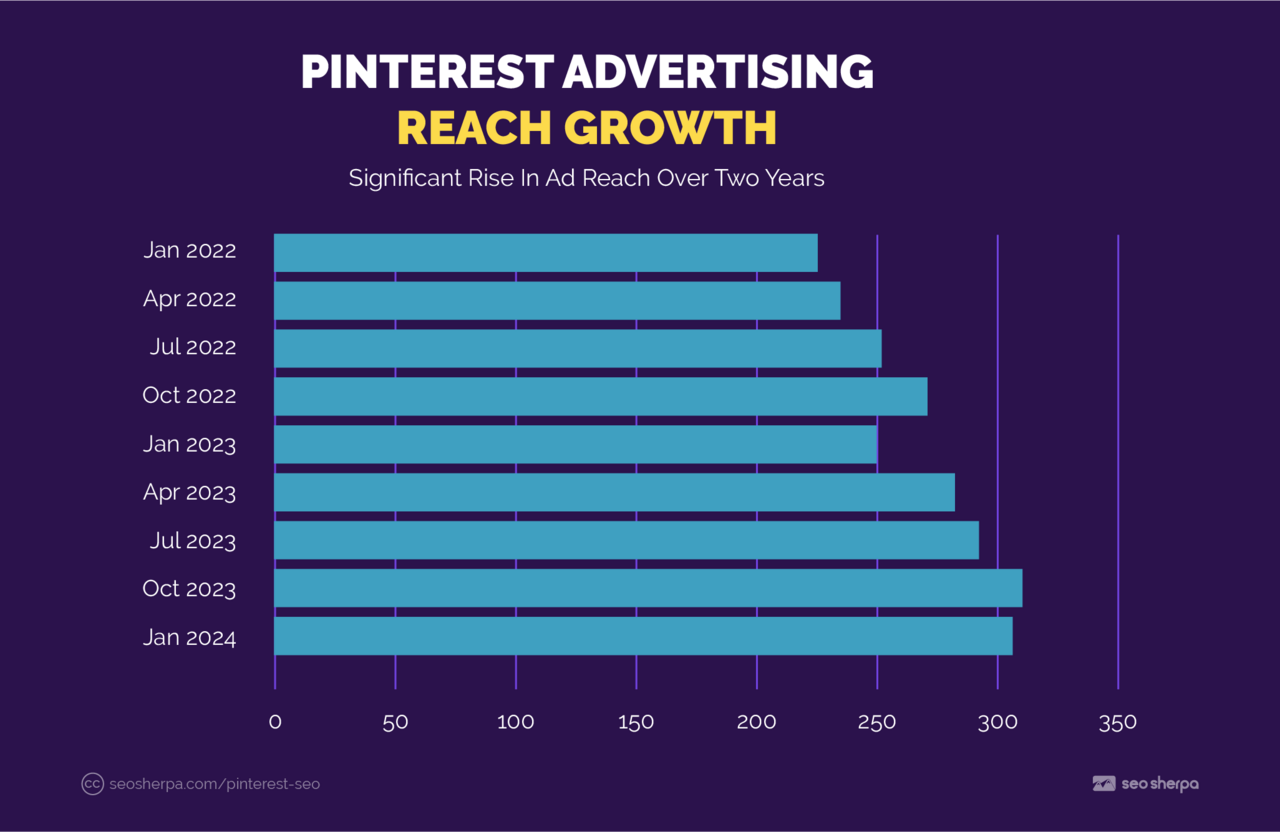 As of January 2024, Pinterest’s reported advertising reach is 307.6 million users. That’s a big jump from 249.7 million the year before.