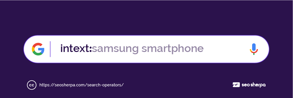 The “intext:” Google search operator helps you find individual words or phrases within a page’s body. “Intext:” is rarely used as this search operator virtually functions the same as any Google search.