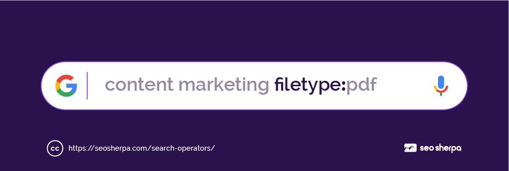 Using “filetype:” will restrict your search results to the specified file type such as PDF, DOCX, PPT, etc. The “filetype:” operator cannot be used on its own. Instead, it must be combined with another term to display results.