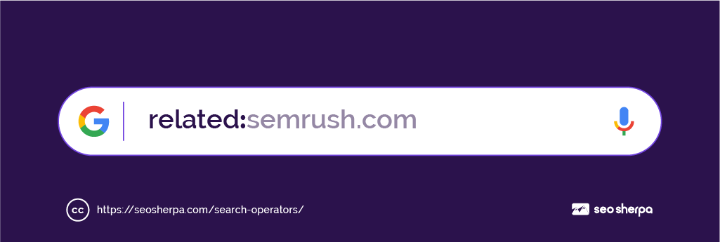 When performing market or competitor research, “related:” will come in handy. The “related:” operator will help you find similar domains to the target URL you’ve included in the search bar.