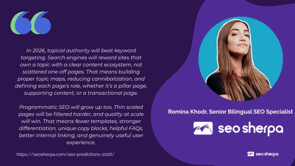 “In 2026, topical authority will beat keyword targeting. Search engines will reward sites that own a topic with a clear content ecosystem, not scattered one-off pages. That means building proper topic maps, reducing cannibalization, and defining each page’s role, whether it’s a pillar page, supporting content, or a transactional page.